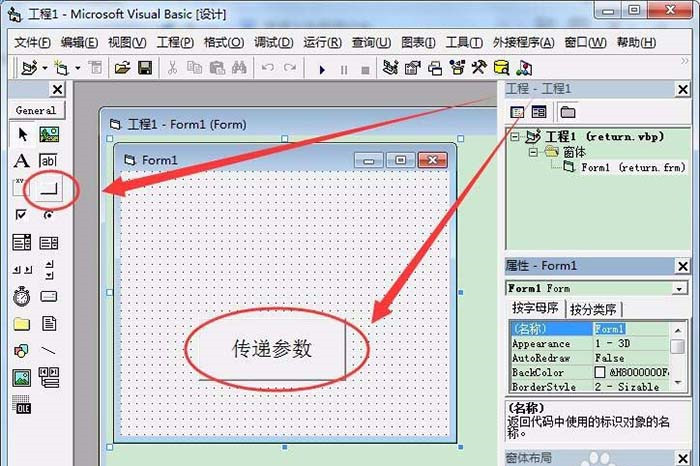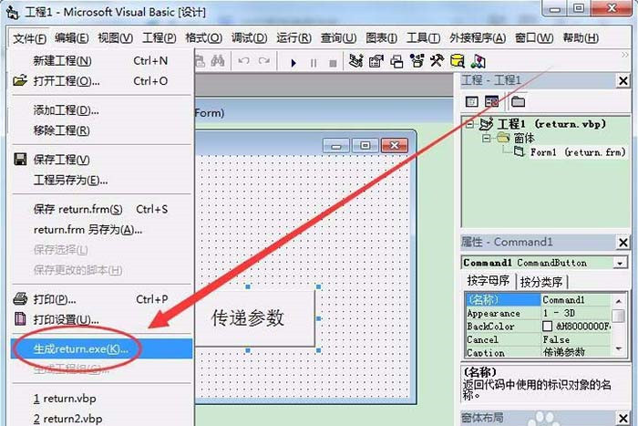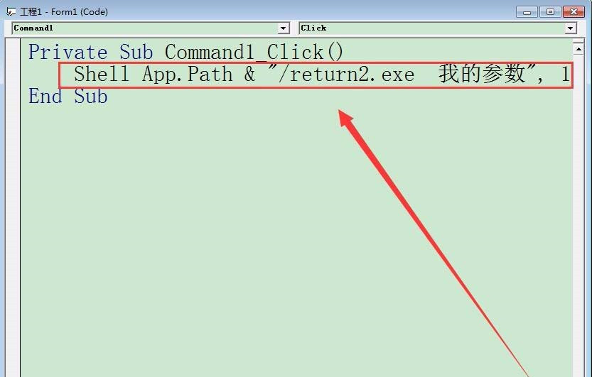 4、打开代码窗口,将设置的参数传递到另一个VB程序。