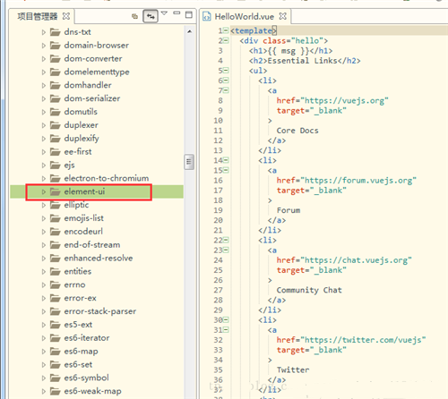 3、安装成功后 ,在node_modules中可以看到 element-ui的文件夹 ,所有安装的源文件可以在这里面找到;