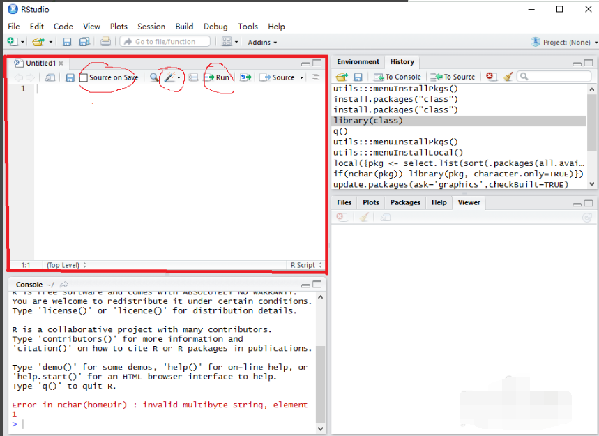 1、打开RStudio软件后,进入软件的主界面,软件的左上角是脚本编辑窗口,您可以在这个窗口中编写代码,您可以点击点击Run按钮就可以运行您编写好的代码了。