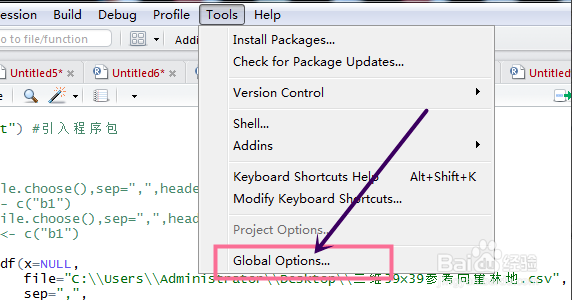 1、打开RStudio软件,打开软件后,如果您发现您输入的中文注释出现了乱码,您可以点击菜单栏的Tools选择,在弹出的下拉菜单中选择 Global Options。