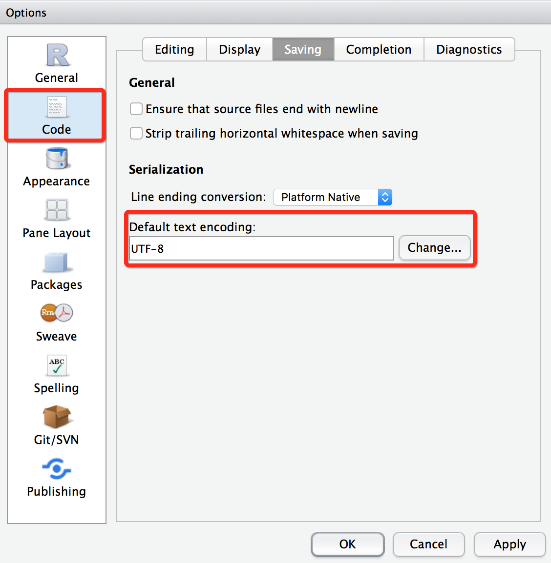 2、打开Options窗口后,点击左侧窗口的【Code】选项,然后点击顶部的【Saving】选项,找到Default Text Encoding选项后的【change】选项。