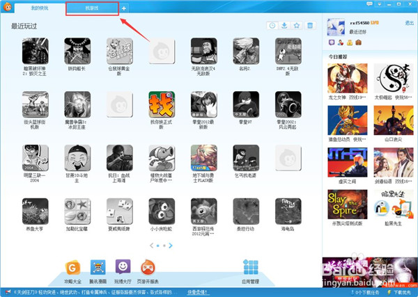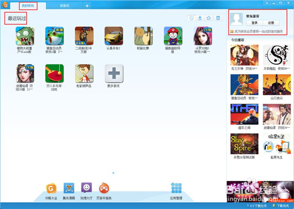 刚打开的界面中,最上方显示的是我的快玩,意思就是你已经下载过的游戏或者最近在玩的游戏会在这个窗口中显示出来。以方便你来找到游戏。右侧是登录账号密码的地方,这里说一下,不登录也可以下载和玩的,不过小编觉得还是登录一下比较好。