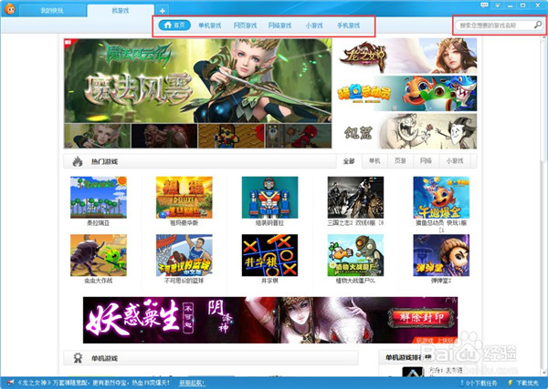 我们在看最上方的【找游戏】选项。打开这个界面后,我们在最上方可以看到有很多游戏的分类,单击的、网络的、网页的等等。看你想玩什么游戏,然后来选项上面的选项。而右侧是搜索栏,如果你是奔着某款游戏来的,直接在里面输入游戏名称来找寻你要找的游戏。