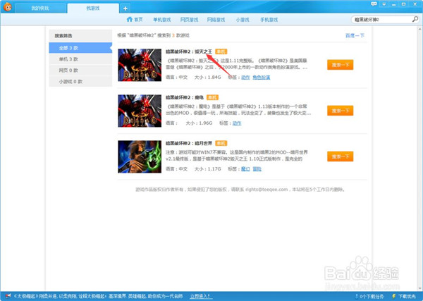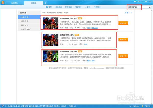 这里小编在搜索栏中输入了暗黑2,搜索出来三种暗黑2的版本,有可能里面没有你想要的,也可能你除了第一个版本外,都不知道其他两个版本。这里我们选择第一个毁灭之王版本。点击打开