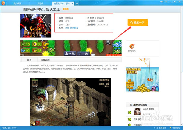 点开以后,如图所示。方框中的是该游戏的简单介绍,下方是游戏的简介。我们点击搜索一下看看。