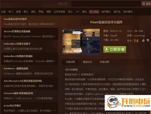 4、商业物品:商业物品功能分类目录中,有背包管理、背包整合、交易助手、快速拾取、售卖助手、物品信息等物品辅助插件供玩家选择。玩家通过设置这些插件可以在游戏中实现银行背包与物品背包整合、自动售卖灰色物品、物品信息增强、自动修理装备、交易信息增强、拍卖助手等物品辅助功能。