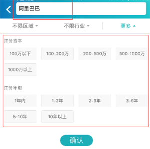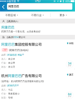 以“阿里巴巴”作为例子(支持模糊搜索哦),可以通过企业名称,有关人名,品牌,联系方式,网址,专利、著作权等关键字或者组合关键字查询公司,也可以通过地区、行业、注册资本和注册年限等进行查询筛选。