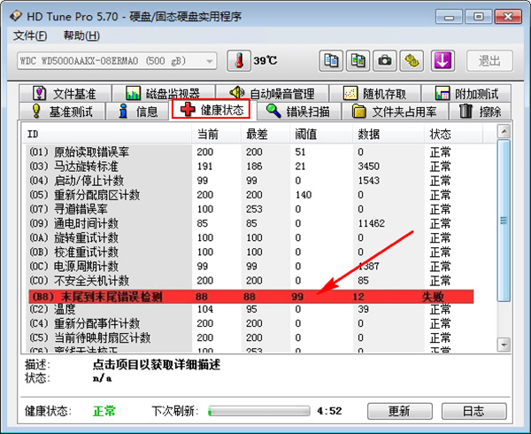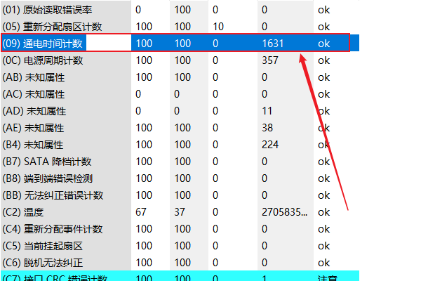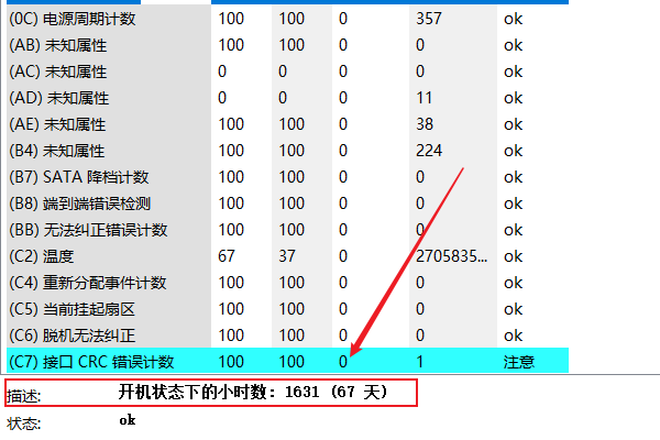01)底层数据读取错误率:这个“数据”值如果大于0,就表明读写发生过问题,不能超过阈值,如果最差值很低,表明硬盘可能有坏道了。