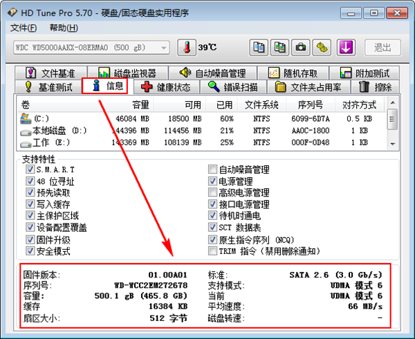 “信息”项是查看硬盘的基本信息包括支持的特性、固件版本、硬盘容量、扇区大小等基本信息。
