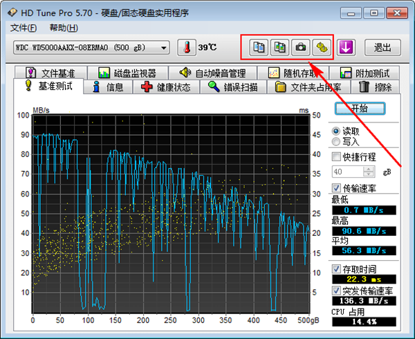 5、在HD Tune软件的顶部有复制测试结果工具,还有为文软件拍照的工具,HD Tune选项也是在这个位置。