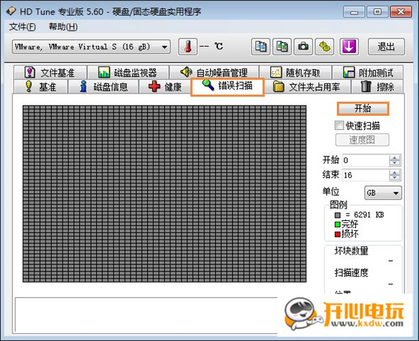 2、检测硬盘错:点击 错误扫描 – 开始,绿色小方块表示硬盘好的部分,没有出现坏道,红色小方块表示硬盘损坏有坏道的部分。