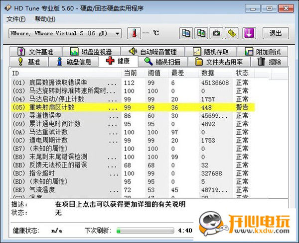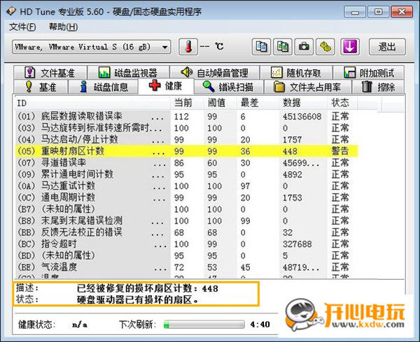 6、我们左键点击:重映射扇区计数,描述:已经被修复的损坏扇区计数448状态:硬盘驱动器已有损坏的扇区。但重映射扇区计数数据没有增长也不是很大,硬盘还是健康的,扫描也没有扫出坏道(注意:重映射的扇区数过多的话会影响读写速度)
