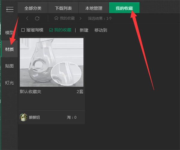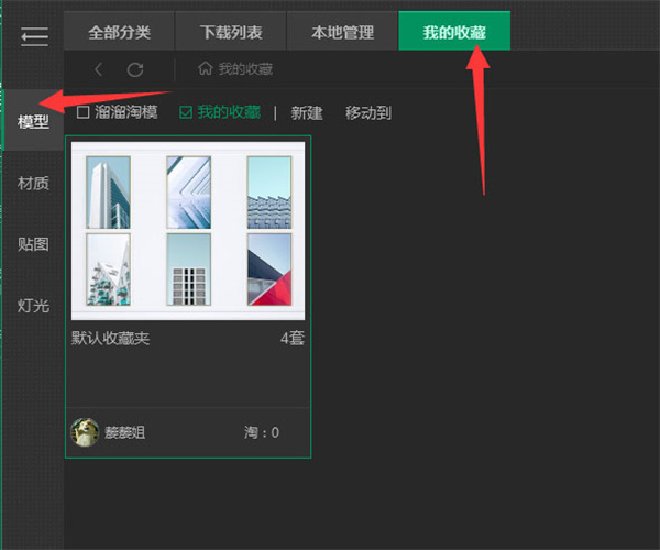 8、收藏的素材,需要在溜云库左侧点击对应的分类,如:查看模型的收藏,点击左侧的【模型】;查看材质的收藏,则点击左侧的【材质】;