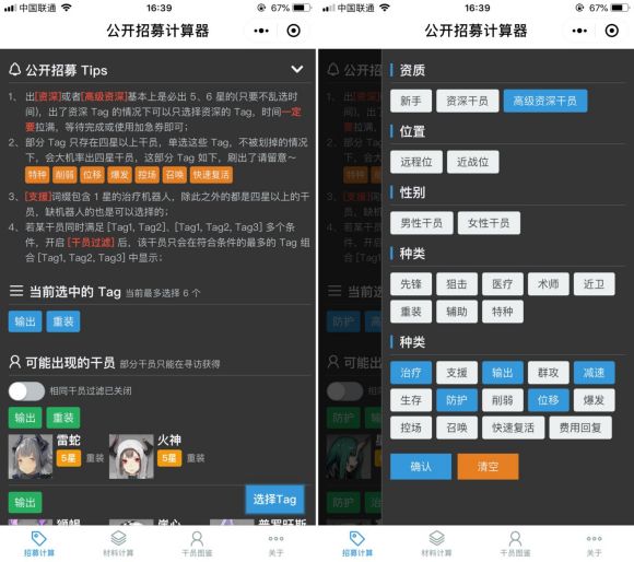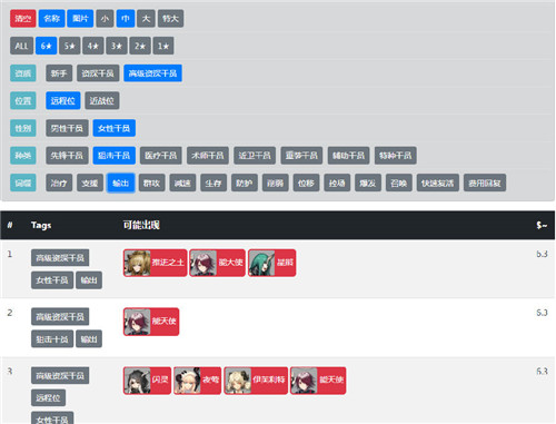 Tag 计算可以查询当前选中的 Tag 会出哪些干员,主要用来选择*优的搭配组合。