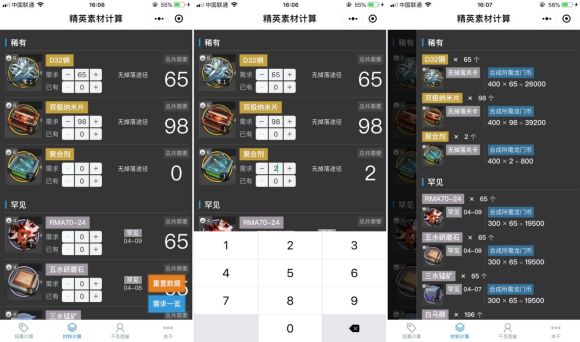 只需在对应的素材下左右,输入需求的素材数量(点击左和右的按钮是累加一,点击中间可直接使用数字键盘输入),就会自动计算出当前素材需要多少个合成素材。