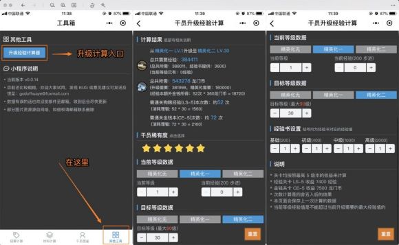 入口在底部导航栏的【其他工具】-【升级经验计算】
