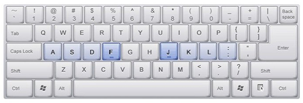 打字之前要将左手的食指、中指、无名指、小指分别放在[F] [D] [S] [A]键上,将右手的食指、中指、无名指、小指分别放在[J] [K] [L] [;]键上,双手的拇指都放在空格键上。