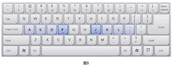 [F]键和[J]键上都有一个凸起的小横杠或者小圆点,育打时可以通过它们找到基准键位。如图9所示: