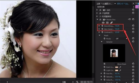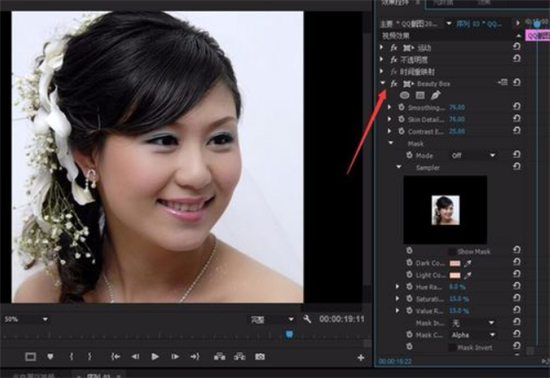 3、打开特效面版 ,找到Beauty Box 插件,把它放入素材的控制面版。可以看到只要把它放进去就可以看到以经有光滑的效果了。