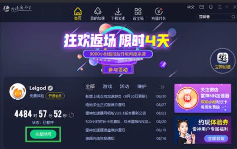 4、恢复时间;用户登录加速器, 点自己昵称圈圈弹出用户中心, 点击时间即时恢复。