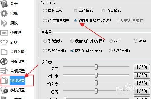 下面点击“视频设置”,在视频设置的页面中选中“硬件加速模式(高级)”。这里可以有效的提升速度,然后点击确定。