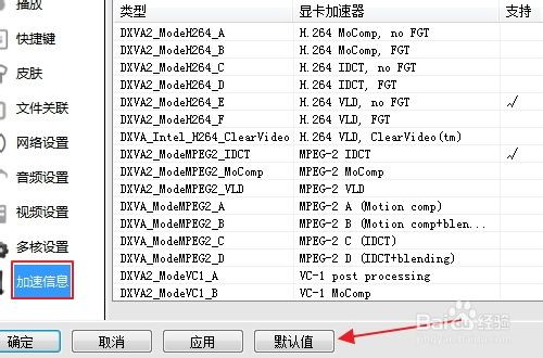 点击“加速信息”随时观看加速的支持情况,如果出现意外情况,点击下面的“默认值”恢复初始状态。
