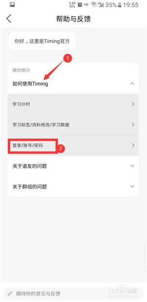 4、在帮助与反馈页面,点击“如何使用Timing”,并进入“登录/账号/密码”。