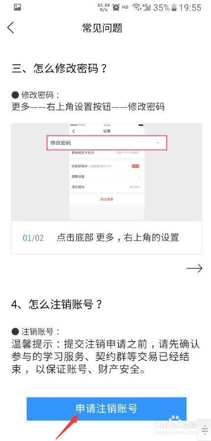 5、进入常见问题页面,下拉至最底部,并点击“申请注销账号”。