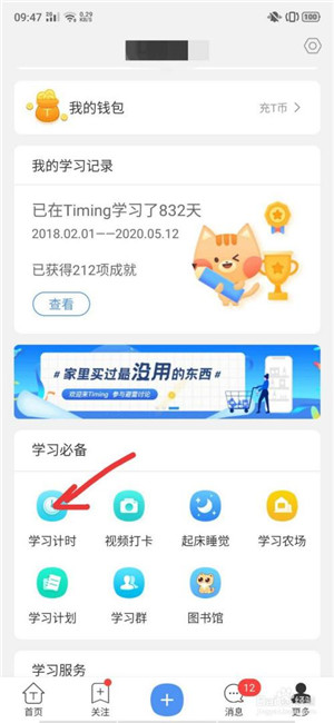 1、进入Timing之后,找到“更多”的选项框,在“学习必备”中点击进入“学习计时”。