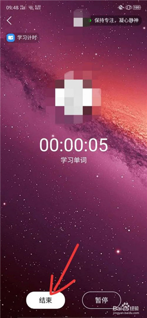 5、完成学习时长,或者中途休息可以根据需求点击“结束”或者“暂停”。