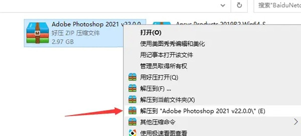 1、使用百度网盘下载Photoshop 2021安装压缩包文件到电脑,鼠标右击压缩包选择解压到“Photoshop 2021”。