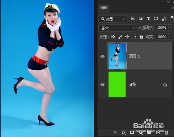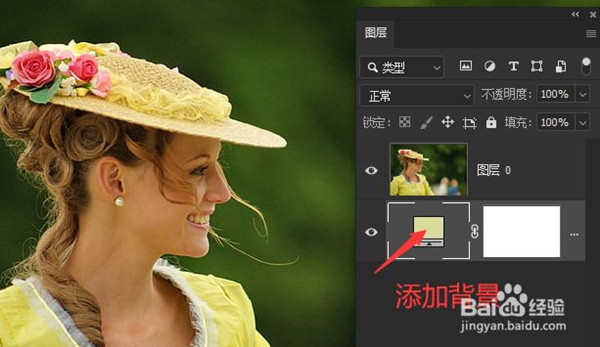 3、为了查看抠图的效果,我们可以在最下方添加一个背景图层,可以使用其他背景图像,也可以添加一个填充图层,这里我添加的是一个纯色填充图层。