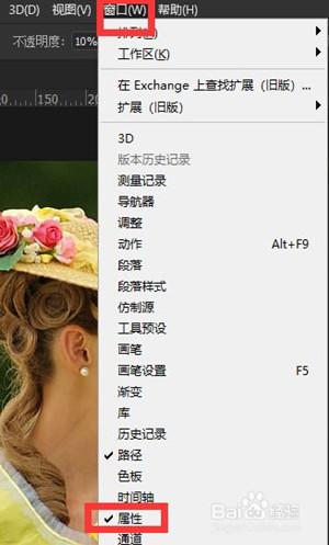 4、好了,万事俱备,只欠东风,我们现在选择上面的美女图层,然后打开属性面板,如果找不到属性面板,就执行菜单命令“窗口-属性”打开它。
