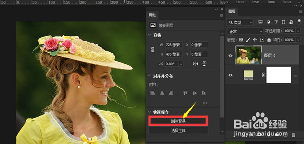 5、此时你就会发现在属性面板种底部的快速操作一栏中出现了“删除背景”按钮。