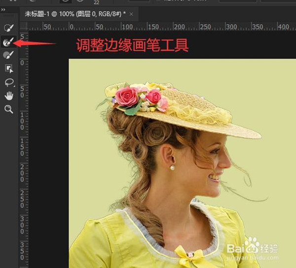 8、如果你感觉删除背景抠图边缘并不十分满意,想把边缘抠选得更仔细一些,特别是带毛发类的图像,那么,你只需要双击图层蒙版即可,这样就可以进入“选择并遮住”这个PS自带最强大抠图命令的界面中,可以使用调整边缘画笔工具涂抹毛发边缘,不过一般的证件照或头发不是很乱的图像直接删除背景就可以了。