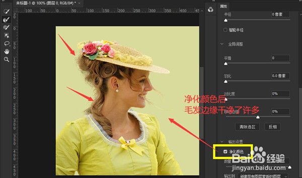 9、如果抠选后毛发边缘有原来的背景色,则可以在属性面板中选择“净化颜色”选项,问题完美解决。