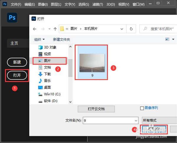 1、我们打开ps2021破解版,然后点击“打开”在“图片”中选择一张需要替换天空的图片。