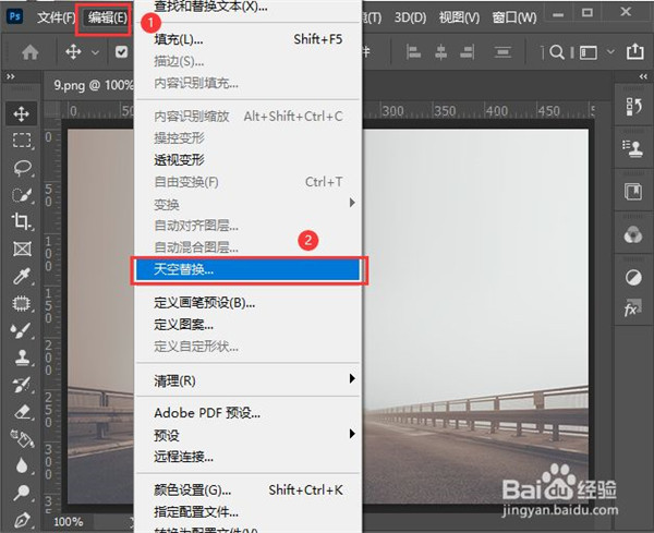 2、接着,我们选中图层,然后在“编辑”中找到“天空替换”。