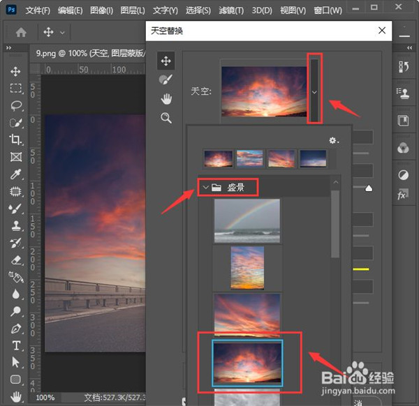 事实上“一键换天空”不是一个新名词,以前,我们都是用手拿的。这一次Adobe直接将其添加到PS中,这节省了抠图的大量工作。调用一张照片(使用天空场景),单击“编辑→天空替换”,稍后PS将打开一个小面板。顶部有几组预设天空,分为蓝天、日落和盛景。如果要替换组“天空”,只需单击预设字段。除了更换天空,前景的亮度和颜色温度也会自动变化,让前景看起来更自然。