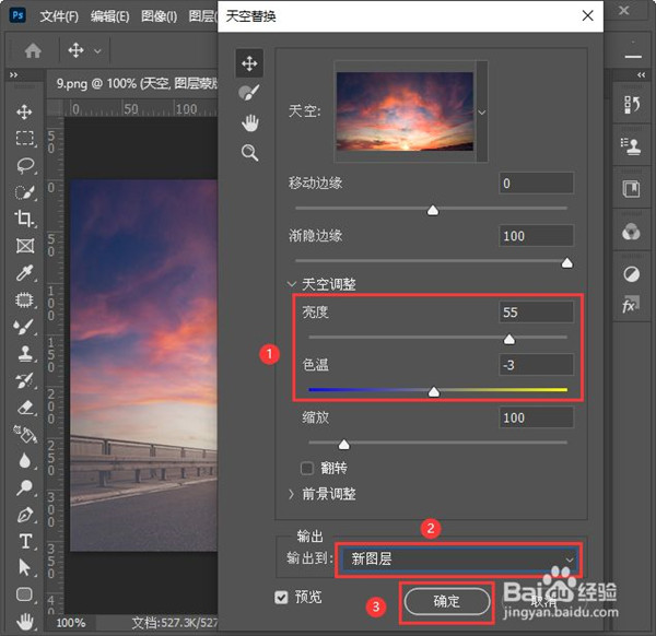 5、接下来,我们可根据自己的需要调整亮度和色温的参数,输出到“新图层”,点击“确定”。
