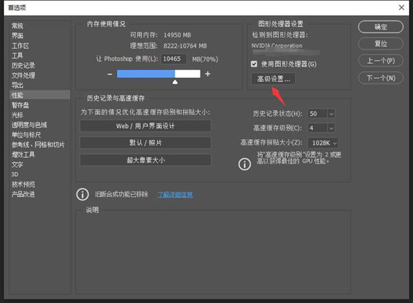 进入PS的首选项设置,点性能,然后在图形处理器中点高级设置: