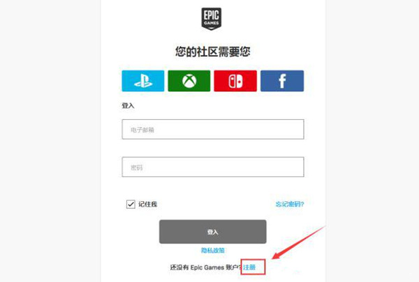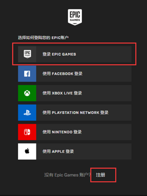 2、有EPIC账号则直接将账号密码输入点击登录,没有账号的则点击注册,如图。