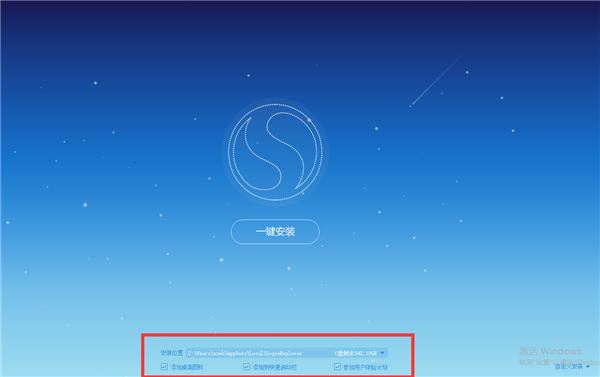 2、用户可以选择默认安装,直接点击一键安装选项,软件就会默认安装到C盘,或者点击自定义安装,选择合适的安装位置后再点击一键安装。在界面下方还有附加的捆绑选项,用户可以根据自己的需要选择后进行安装。(小编建议用户选择自定义安装,将软件安装到其他盘中。C盘为系统盘,软件过多会导致电脑运行变慢。)