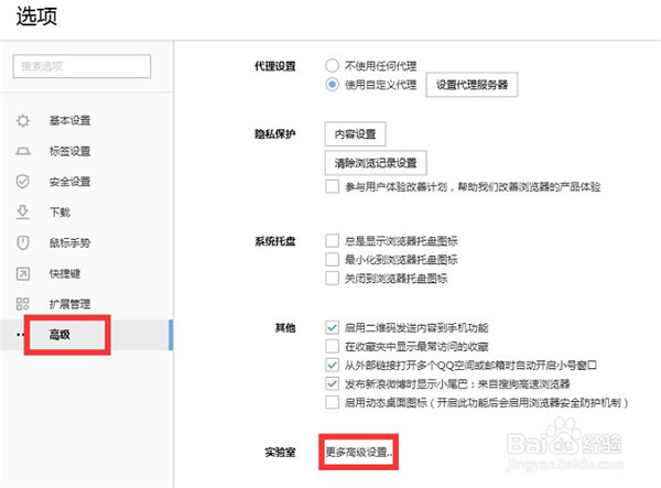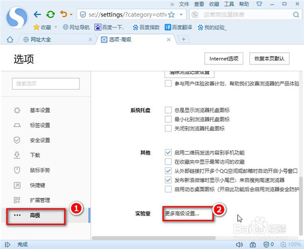 2、在选项里面的左侧点击“高级”设置,在高级设置列表里点击“实验室”右边的“更多高级设置”。