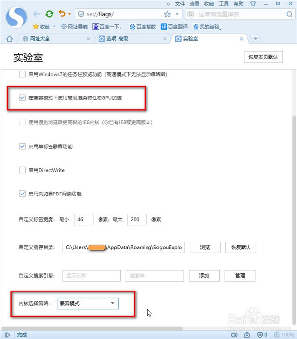 5、选中“在兼容模式下使用高级渲染特性和GPU加速”,并将内核选择策略请选择为“兼容模式”。