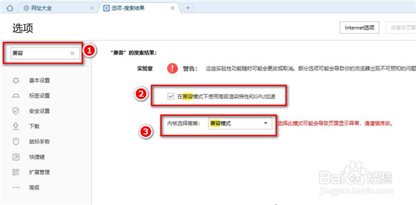 6、另外,如果在“高级”选项下找不到“兼容模式”,可以在设置界面搜索框中输入“兼容”(图示位置1),然后按下Enter键,接着就会在界面上看到“在兼容模式下使用高级渲染特性和GPU加速”和“内核选择策略”选项啦。