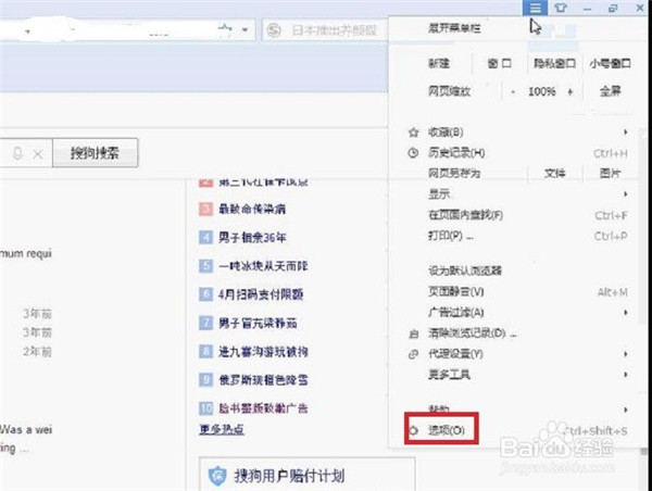1、打开搜狗浏览器,在浏览器的右上方点击菜单即三条横线的图标,在菜单里面点击“选项”。