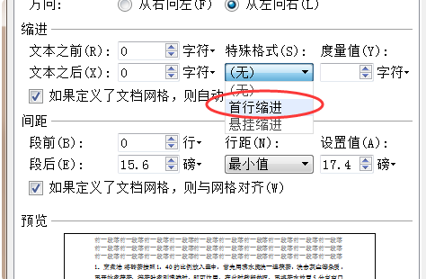 5、在缩进选项卡中点击特殊格式后面的下拉按钮,选择特殊格式,我们选首行缩进选项,后面的磅值会自动出现2字符。