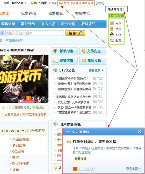 一、通过站内信息:在5173首页点击“您有N条未读站内信”或主页右下角“5173提醒您”中查询: