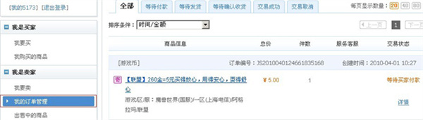 2、对于卖家:您可以登录5173帐号→我的5173→我是卖家→我的订单管理进行查询。